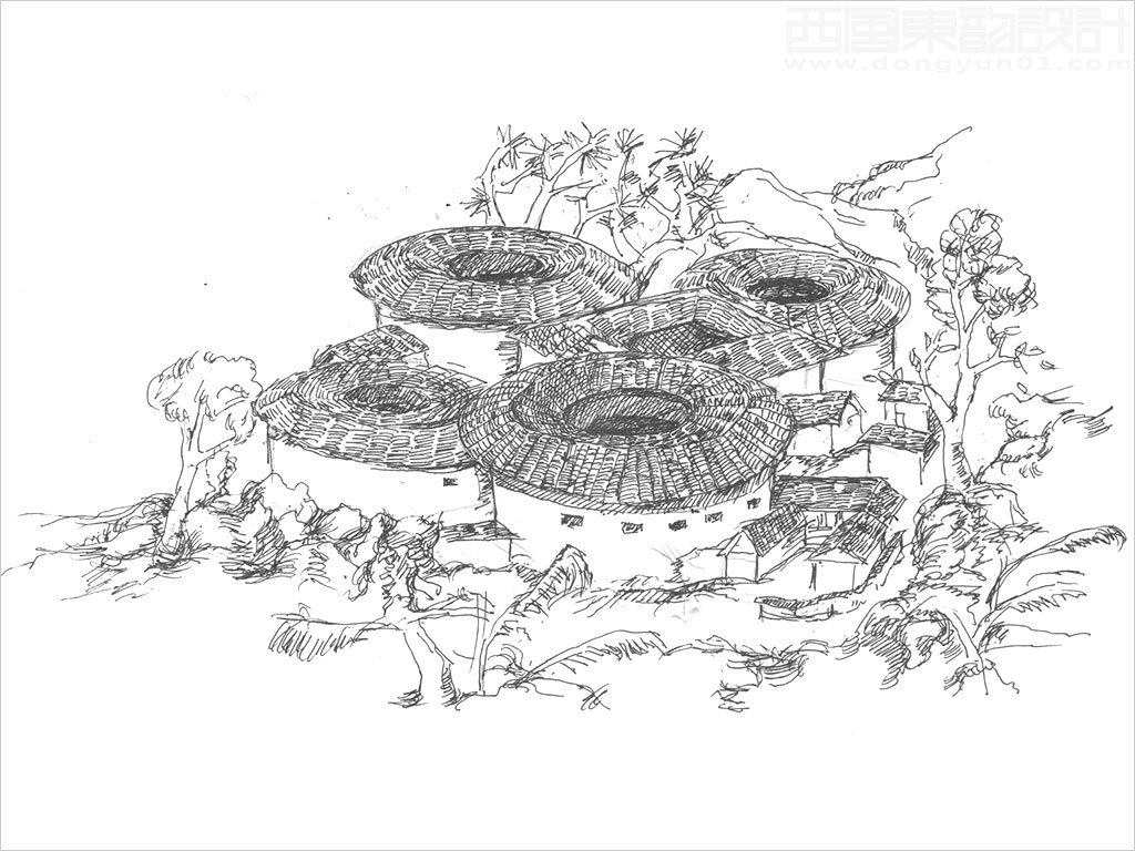 貴仕茶業(yè)公司鐵觀音茶葉禮盒包裝設(shè)計(jì)核心元素----福建客家土樓手繪圖