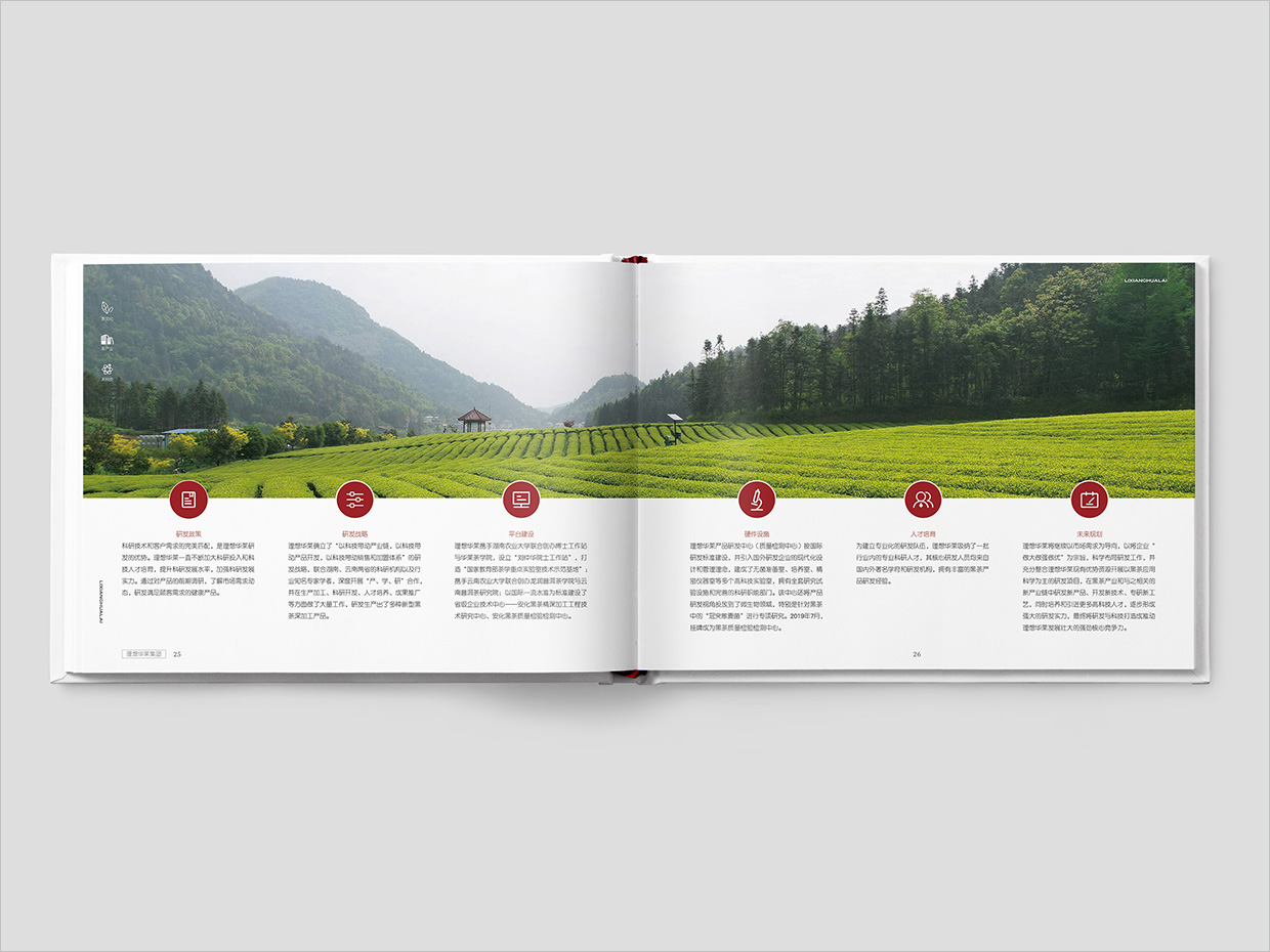 理想華萊科技集團公司畫冊設計的封面采用了精裝鏤空卡套的形式,這種設計不僅提升了畫冊的整體質感,還通過鏤空的部分巧妙地展示了內部內容的精髓。封面的主色調以深紅色為主,象征著黑茶的深厚歷史和文化底蘊,同時通過品牌logo燙金的工藝,突顯品牌的高端定位和科技感,整本畫冊圍繞茶文化、茶產業(yè)、茶科技的融合進行內容的布局,既保留了傳統(tǒng)茶文化的韻味,又融入了現代科技的元素。通過精美的視覺呈現和詳實的內容,畫冊不僅傳達了理想華萊的品牌價值,還為讀者提供了一次深入了解黑茶產業(yè)的機會。通過精心的設計和內容編排,理想華萊科技集團公司畫冊設計成功地將茶文化、茶產業(yè)和茶科技融為一體,為讀者帶來了一場視覺和思想的盛宴。