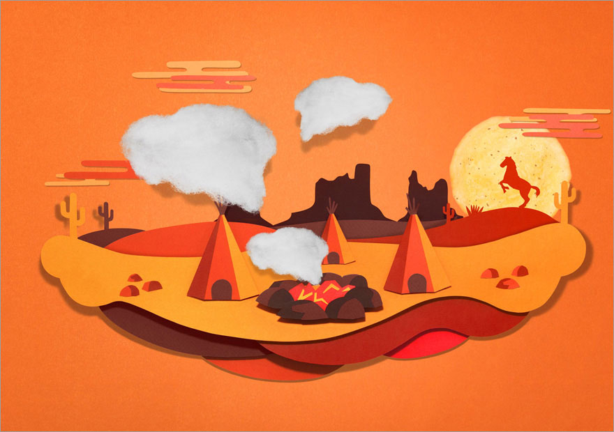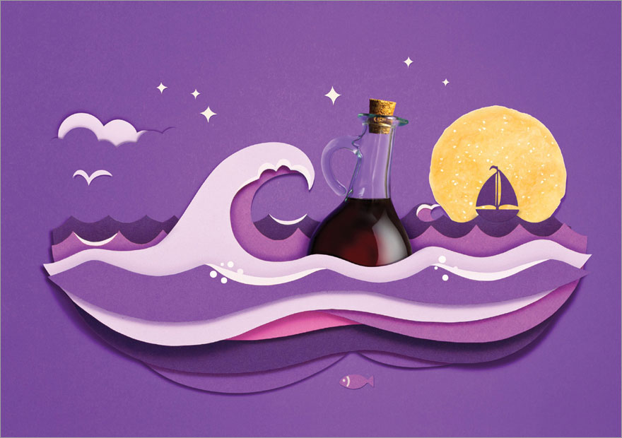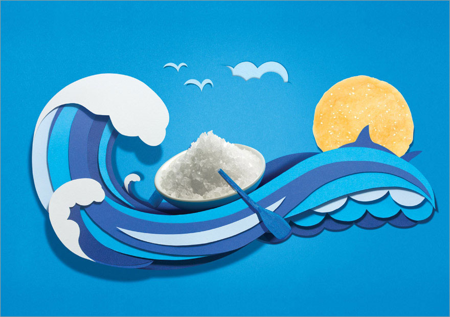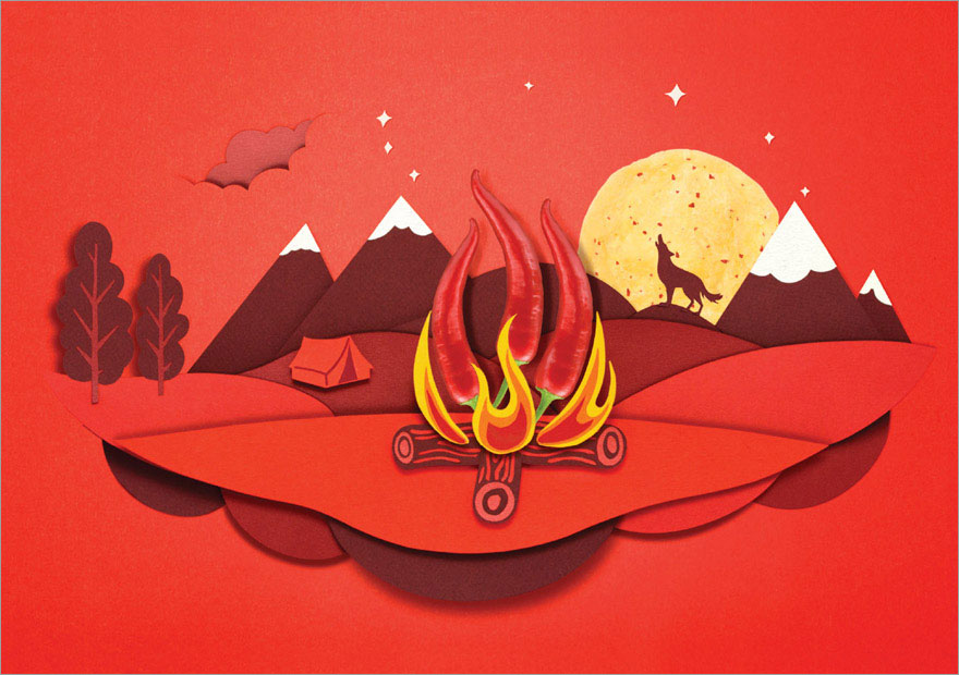 Popchips這個名字讓我們創(chuàng)建了一個透視模型,在這個模型中,元素會隨著光和陰影跳出頁面。這后來成為該品牌的一個持續(xù)主題,并以彈出式書籍和顯示器的形式擴展到銷售點。我們給自己制定的規(guī)則之一是確保立體模型的場景總是有一個想法。為了鹽&胡椒變體我們創(chuàng)建了一個風(fēng)暴設(shè)置的分層卡。這個場景就像一場味道風(fēng)暴,給你的薯條加了一點拉鏈。消費者將用胡椒磨粉機來識別該變體,因為它與變體名稱相似。整個生產(chǎn)過程是無法在計算機上單獨復(fù)制的。這幅紙的立體模型作品耗時500多個小時完成,被拍攝下來,拿到電腦上打印,然后用凹版印刷工藝打印出來。