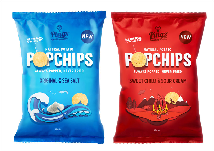 Popchips是一種四種口味的薯片,由Ping公司出品。這種薯片被做成爆米花的樣子,而不是用來制作健康的零食??偛课挥谛挛魈m的Marx Design負(fù)責(zé)為Ping開發(fā)一個新的包裝形象設(shè)計,它可以跨休閑零食類的多種產(chǎn)品應(yīng)用,并為Popchips品牌開發(fā)一個包裝設(shè)計解決方案,該解決方案將避免傳統(tǒng)薯片類休閑食品包裝設(shè)計的陳詞濫調(diào)。